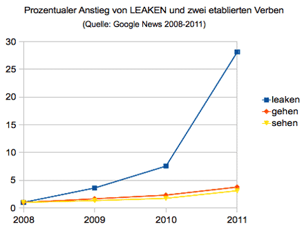 Das Problem ist, dass es keine zuverlässigen Korpora gibt, die den Sprachgebrauch des Jahres 2011 bereits erfassen. So musste sie sich auf die Google-News-Suche verlassen, die sowohl aktuell genug ist als auch eine Einschränkung auf einzelne Jahre erlaubt. Und die eindeutig einen massiven Anstieg der Häufigkeit von leaken zeigt: Das Wort war 2011 mehr als doppelt so häufig wie im Vorjahr.